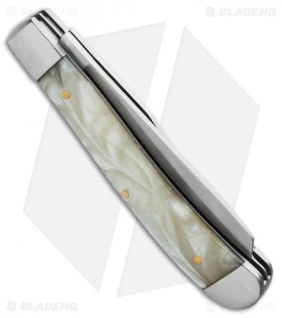This lovely and affordable 2 blade knife is conveniently sized for pocket or purse. Made from 3Cr13MoV stainless steel with stainless steel bolsters and brass pins over stainless steel liners, this attractive knife will stand up to years of daily chores. The cracked ice celluloid handles. It has a classic look that will last. The slightly curved handles have a good feel in your hand, and the light weight makes this and easy to handle knife. The Imperial Trapper pocket knife is a classy and generous gift.