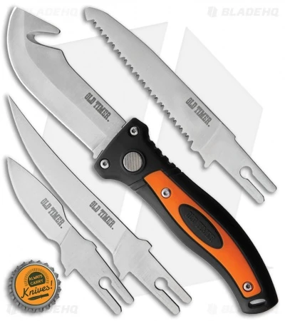 The Switch-It combo has 4 interchangeable blades including a gut hook, boning knife, a saw, and a skinner. It comes with an orange synthetic belt sheath making travel carry convenient. Each blade is high carbon stainless steel. The polymer black and blazing orange handle is comfortable and provides a strong grip for any hunting action.