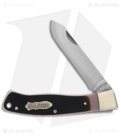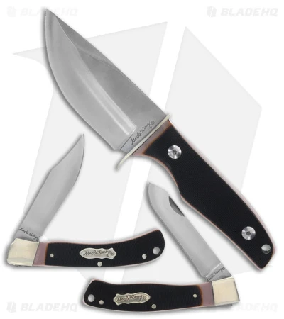 This Schrade Uncle Henry combo pack includes one fixed blade knife and two pocket knives with folding blades. The fixed blade has a guard and a wide blade, one pocket knife has a drop point blade, and the other pocket knife has a clip point bowie blade. Pick up this set as a gift to yourself or to a loved one!