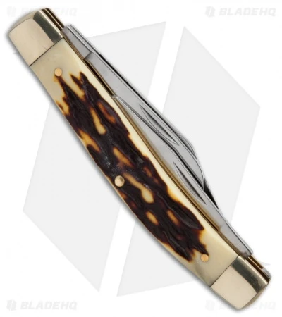 This Uncle Henry classic Rancher pocket knife is an American tradition. Often found in many of our grandfather pockets, this folding knife features satin finished stainless steel clip point and sheepsfoot blades on one end and a pen blade on the other end with slip joint construction. The canoe-shaped handle features Staglon scales, brass liners, polished nickel silver bolsters, and brass rivet construction.